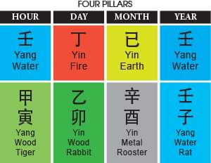 This person’s chart possesses the Internal Flowerof Romance; however, it is severely afflicted by the Rat and Rabbit clash, as well as the Rabbit and Rooster clash. Prognosis: severe difficulty in getting married, unless there is a Horse in the 10 year luck pillars. Marriages will also be conflicting unless this person marries his secret friend the Ox or one of his allies, the Dragon or Monkey (marrying the Monkey means difficulty inhaving children).
